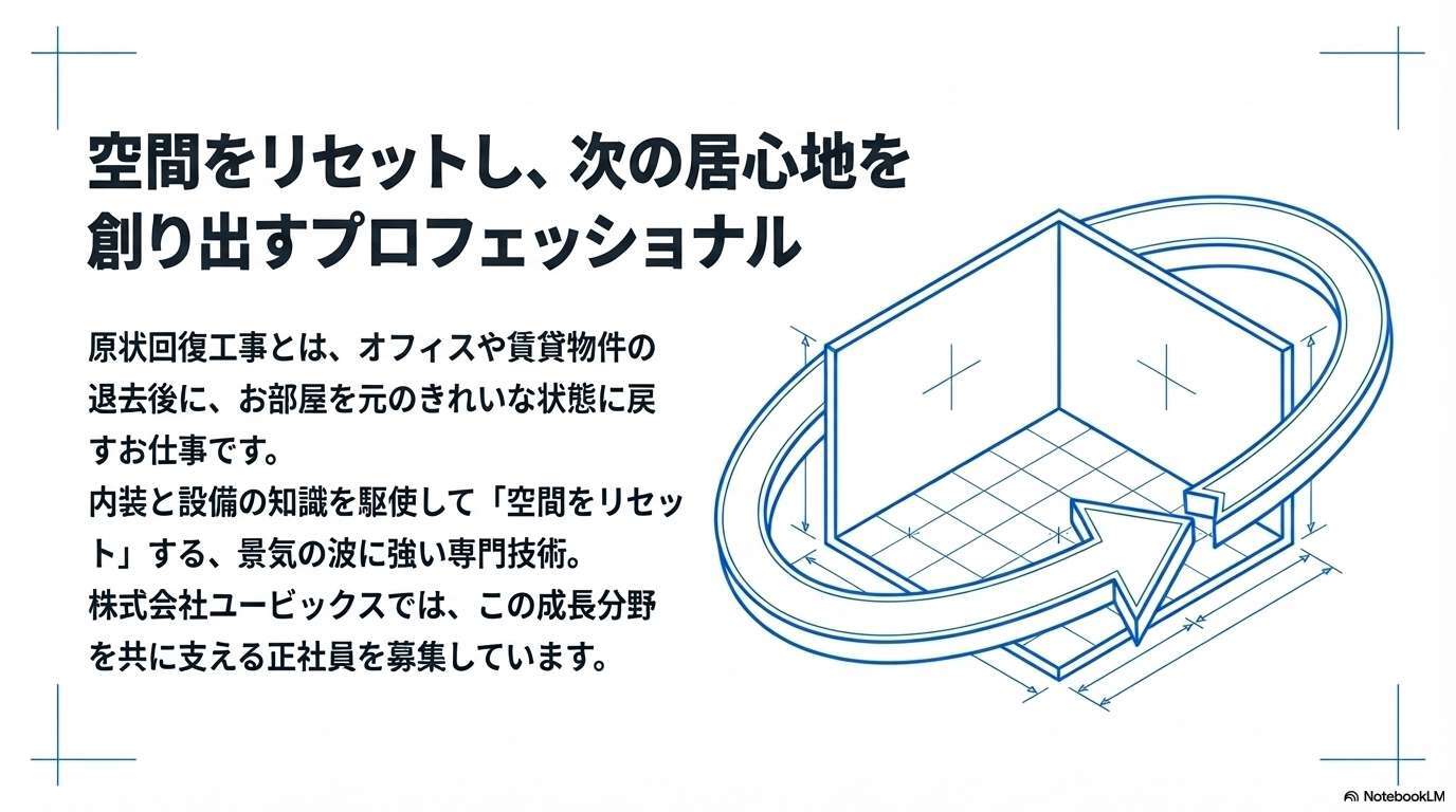 原状回復工事とは、オフィスや賃貸物件の退去後に、お部屋を元のきれいな状態に戻すお仕事。まさに「空間をリセットし、次の居心地を創り出す」内装・設備のプロフェッショナルです。
