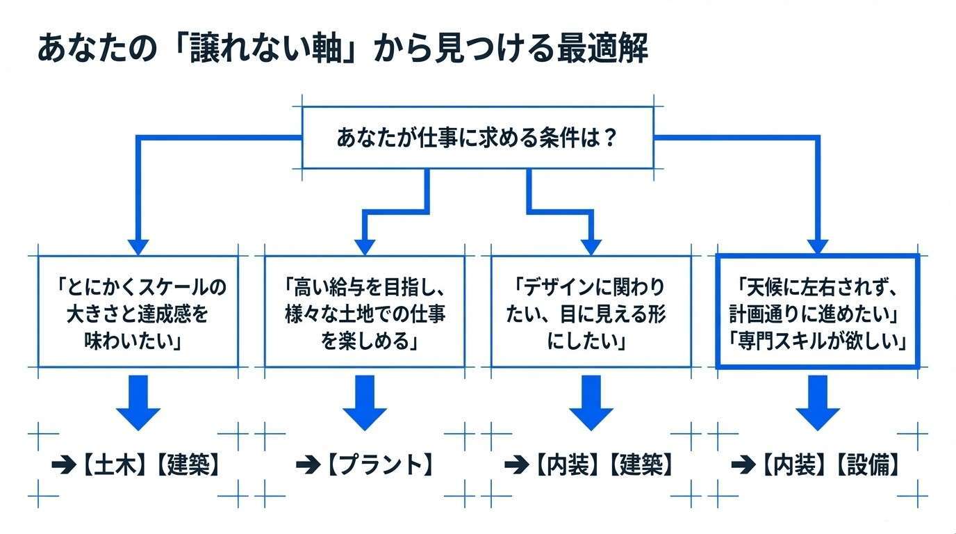 建設業界で長く、あなたらしく活躍し続けるためには、まず「各分野の違い」を正しく理解し、自分の志向に合った業種を選ぶことが最重要です。