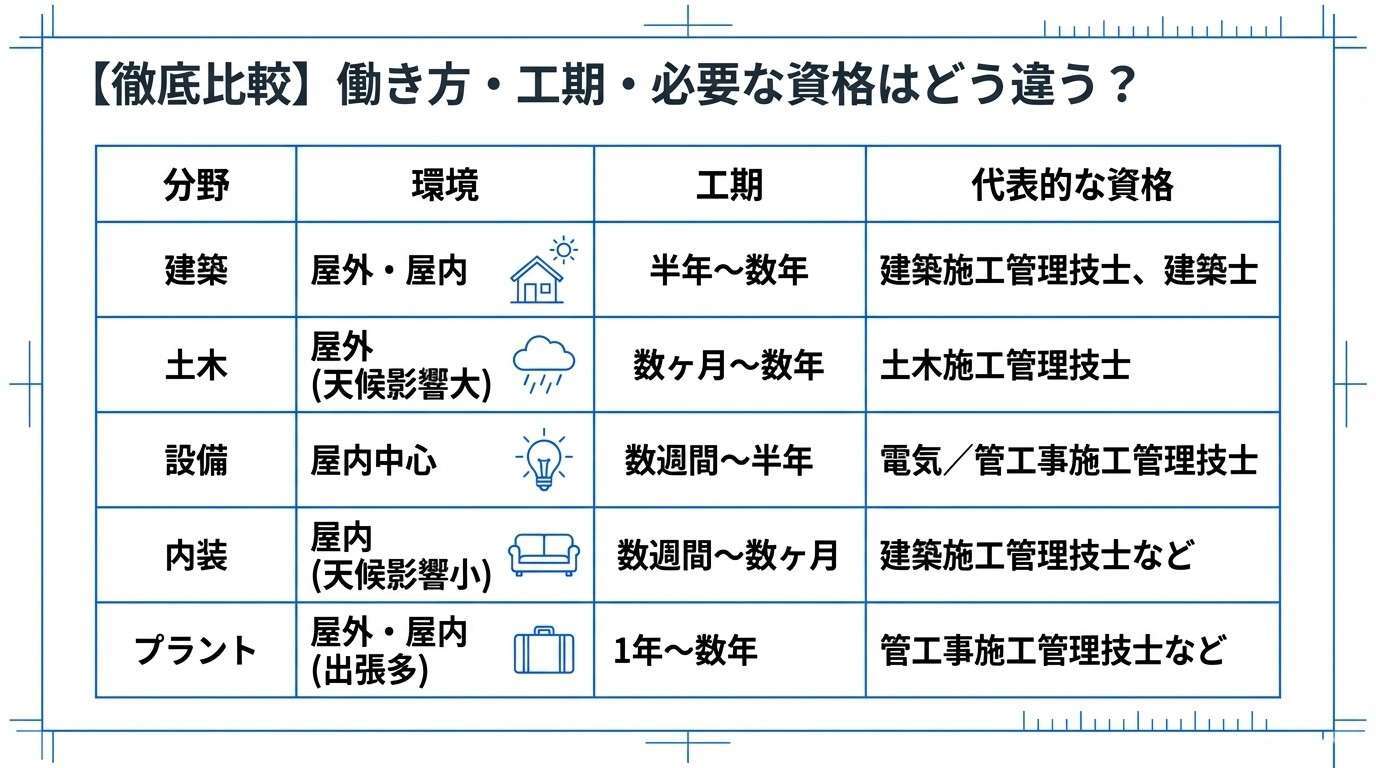 なぜなら、施工管理は「何を作るか(業種)」によって、仕事内容も、職場の環境も、求められるスキルも全く異なるからです。